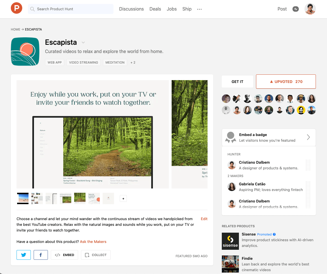 We created a launch plan including the original Reddit community, our personal social media accounts but also a big launch on ProductHunt, one of the biggest communities for tech products. We were very happy with the result, accumulating more than 270 upvotes and ending up in the top ranked launches for the week and gaining lots of organic traction from posterior blog posts.