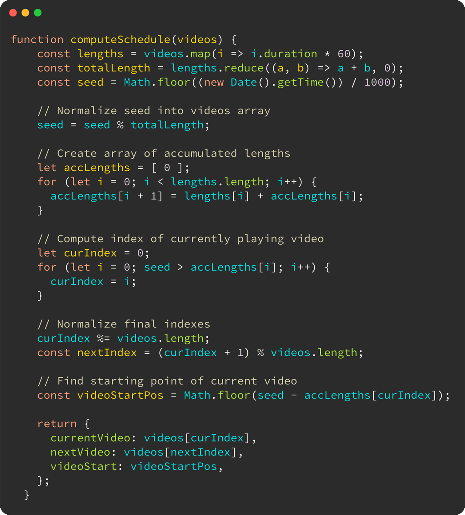 Even though the channels’ schedules are live, just like in a regular TV channel, there’s no real syncing mechanism in the background. I’ve developed a simple algorithm that runs in the client and that uses the computer clock (which is automatically synced by the Operational System) as a index for videos. This enables anyone sharing the link with a friend or family member to watch the same video, provided they’re at the same timezone, while doing a call for example.