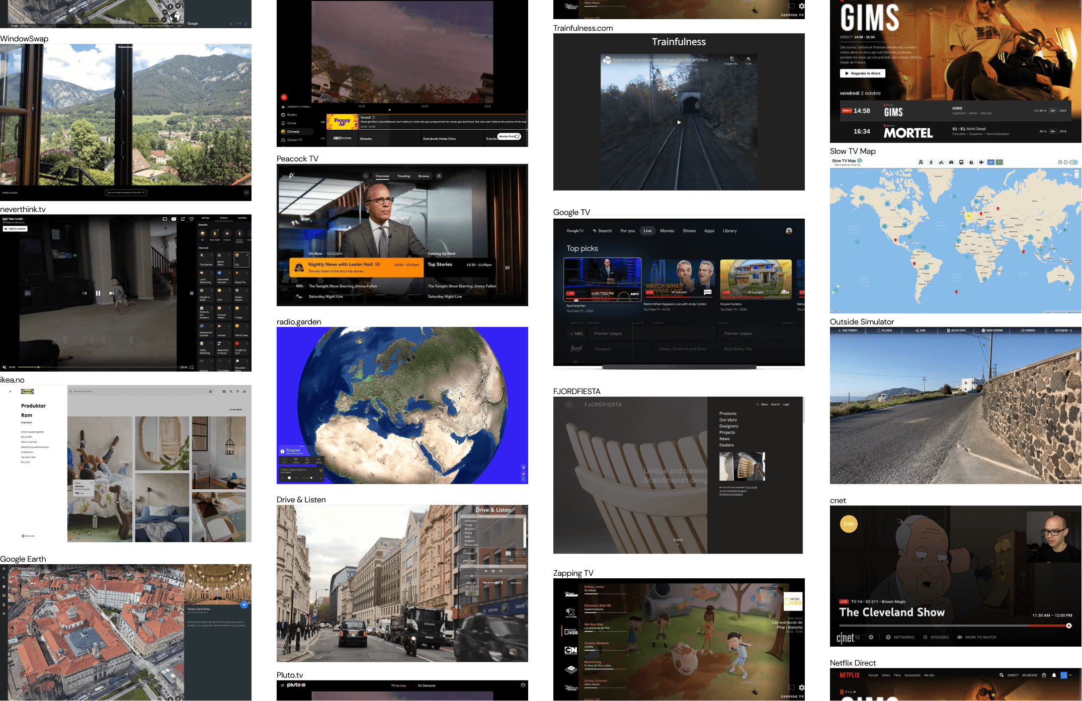 Our research started diving into the topics of Slow TV, reading all articles, watching all talks and listening to all podcasts we could find on the subject. We also read a lot also current trends for online streaming and a growing trend on transcending the algorithms and bringing human curation back.